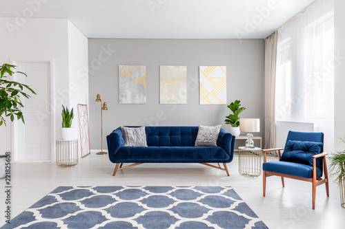 Open Space Living Room Interior With A Navy Blue Sofa And An - View Full