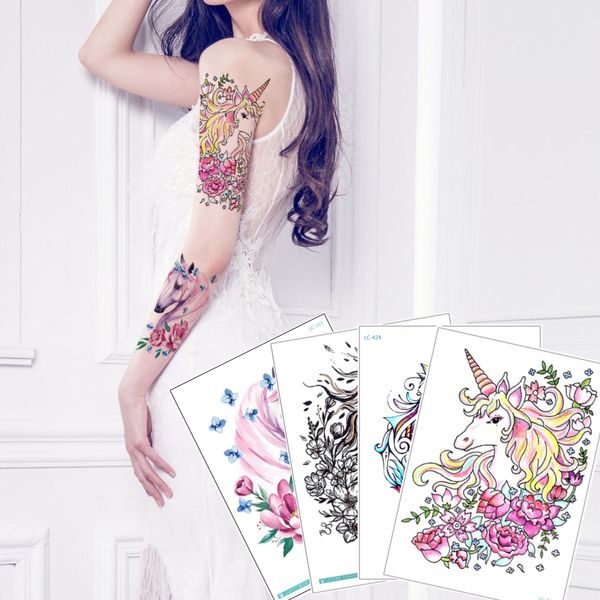 Cute Unicorn Temporary Tattoo Design For Woman Man Kid Horse Flower Butterfly Decal Body Arm Leg Chest Back Art Tattoo Sticker Lovely Summer Henna - View Full